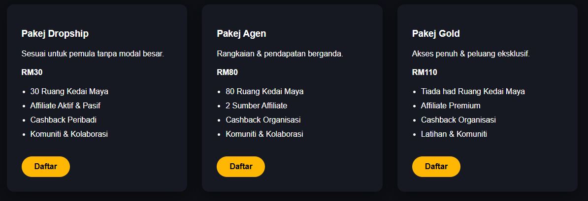 Setiap ahli boleh mendaftar dengan membeli produk/perkhidmatan dan memilih pakej yang disediakan.