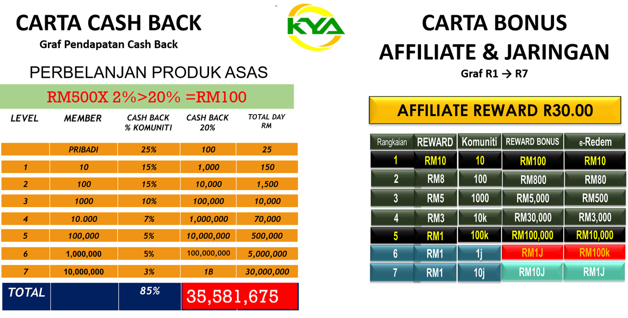 Simulasi pendapatan CASH BACK sekiranya setiap komuniti berbelanja di sistem kya dengan nilai #RM100 -# RM500 dalam masa sebulan.
